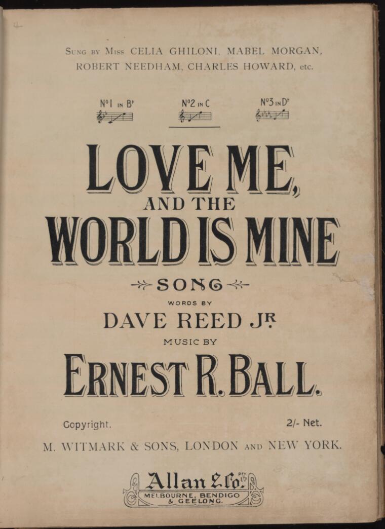"Love Me and the World Is Mine" (audio clip) music by Ernest R. Ball (1906), a barbershop song. Period sheet music cost 50 cents. On some lyric sheets, it says "sung by Miss Celia Ghiloni, Mabel Morgan, Robert Needham, Charles Howard, etc.". Click the audio clip link to hear it sung in Swedish by Jussi Bjorling (from Amazon.com), you need RealPlayer to hear it. If I can find one in English or solo piano, I'll post it here.